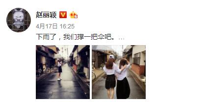 4月17日下午,赵丽颖发文:“下雨了,我们撑一把伞吧。”并配了两张照片,照片中赵丽颖与伙伴同行,撑伞只撑了自己这半边。逗逼呆萌,十分可爱。